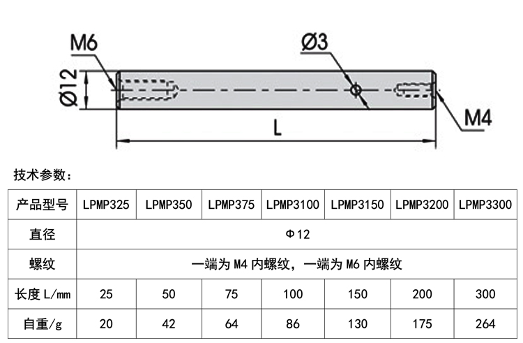 产品详情 LPMP3系列光学不锈钢支撑杆 实验设备转接 在线咨询 产品详情 ● 采用优质不锈钢精磨而成,精度高,美观大方 ● 多种规格可满足不同需要 ● 配合本公司其它调整架使用,通用性强 ● 可沿轴向打标刻度,直观而且美观 本产品主要用途是通过螺纹孔位结合本公司光学平台,实现光学元器件的连接 以满足不同实验的需求,搭建光学系统,光学支撑杆有多种长度,支持定制, 此支撑杆一端为M4内螺纹,一端为M6内螺纹可连接以及转接各种光学元器 件满足不同需求。