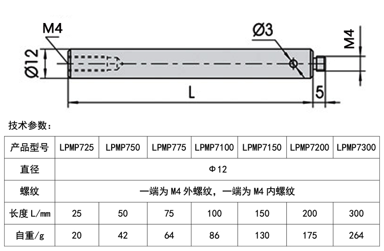 产品详情 LPMP7系列光学不锈钢支撑杆 实验设备转接 在线咨询 产品详情 ● 采用优质不锈钢精磨而成,精度高,美观大方 ● 多种规格可满足不同需要 ● 配合本公司其它调整架使用,通用性强 ● 可沿轴向打标刻度,直观而且美观 本产品主要用途是通过螺纹孔位结合本公司光学平台,实现光学元器件的连接 以满足不同实验的需求,搭建光学系统,光学支撑杆有多种长度,支持定制, 此支撑杆螺纹一端为M4外螺纹,一端为M4内螺纹。可连接以及转接各种光学 元器件满足不同需求。