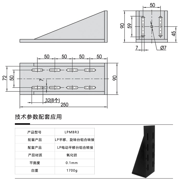 产品详情 LPMBR3直角安装板 实验适配应用 在线咨询 产品详情 ● 主要用于将位移台组合成两维或三维正交系统,也可将其它调整架正交组合 ● 两正交面精密加工,保证垂直度要求 ● 多种安装孔位设计通用性强 本产品主要用途是通过多孔位的直角安装孔,方便实验应用中转接其他光学 器件,实现光学器件良好的固定与转接,表面竖直安装板中有多个孔位,包 括8个长32mm宽7mm的长条固定孔位,LPMBR3直角安装板主要适用于LP TA系列电控平移台的组合安装及其他平移台的竖直固定