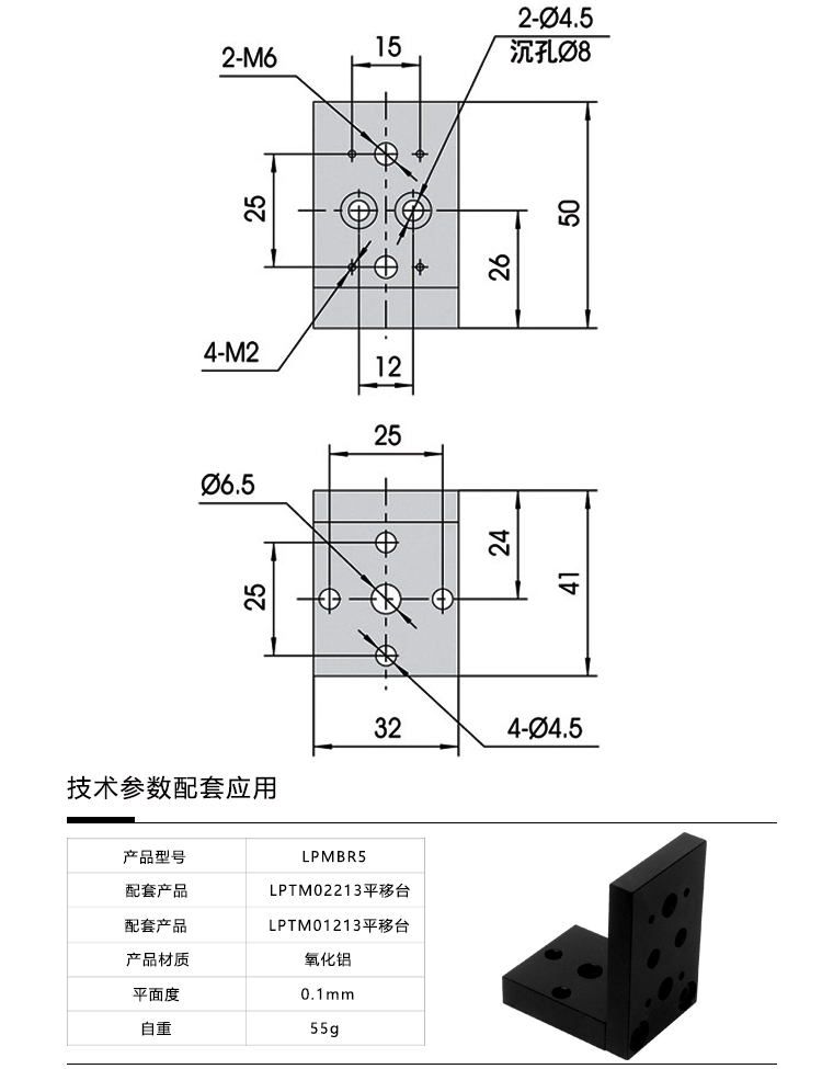 产品详情 LPMBR5直角安装板 实验适配应用 在线咨询 产品详情 ● 主要用于将位移台组合成两维或三维正交系统,也可将其它调整架正交组合 ● 两正交面精密加工,保证垂直度要求 ● 多种安装孔位设计通用性强 本产品主要用途是通过多孔位的直角安装孔,方便实验应用中转接其他光学 器件,实现光学器件良好的固定与转接,表面竖直安装板中有多个孔位,包 括M2螺纹孔固定孔位以及沉孔、通孔孔位,LPMBR5直角安装板主要适用于 LPTM系列手动平移台的组合安装及其他平移台的竖直直角固定