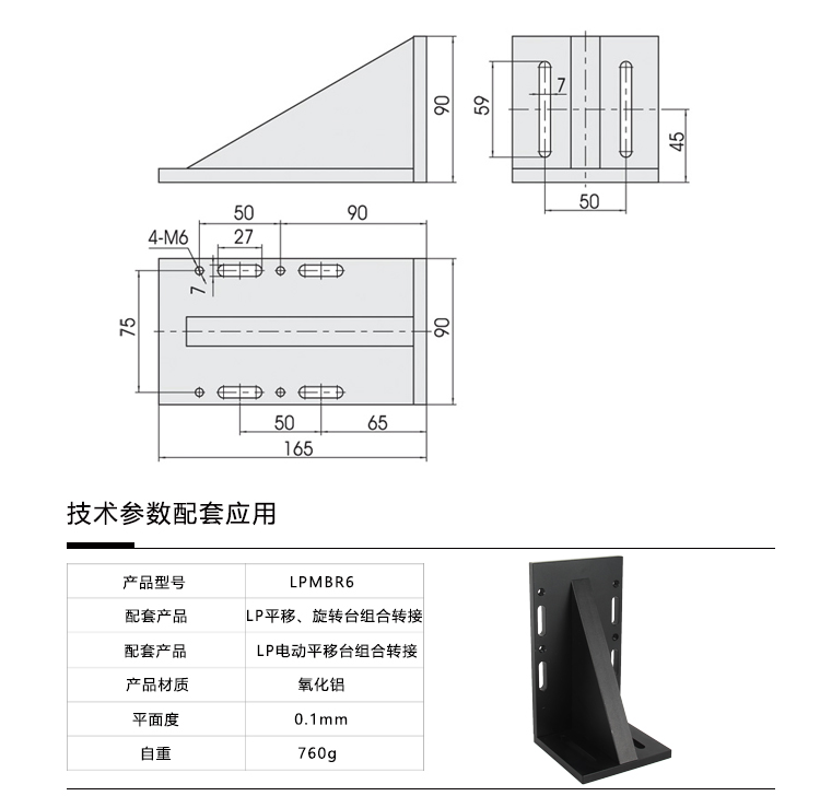 产品详情 LPMBR6直角安装板 实验适配应用 在线咨询 产品详情 ● 主要用于将位移台组合成两维或三维正交系统,也可将其它调整架正交组合 ● 两正交面精密加工,保证垂直度要求 ● 多种安装孔位设计通用性强 本产品主要用途是通过多孔位的直角安装孔,方便实验应用中转接其他光学 器件,实现光学器件良好的固定与转接,表面竖直安装板中有多个孔位,包 括4个M6固定孔位,四个长27mm宽7mm孔位,LPMBR6直角安装板主要 适用于LPTA系列电控平移台的组合安装及其他平移台的竖直固定