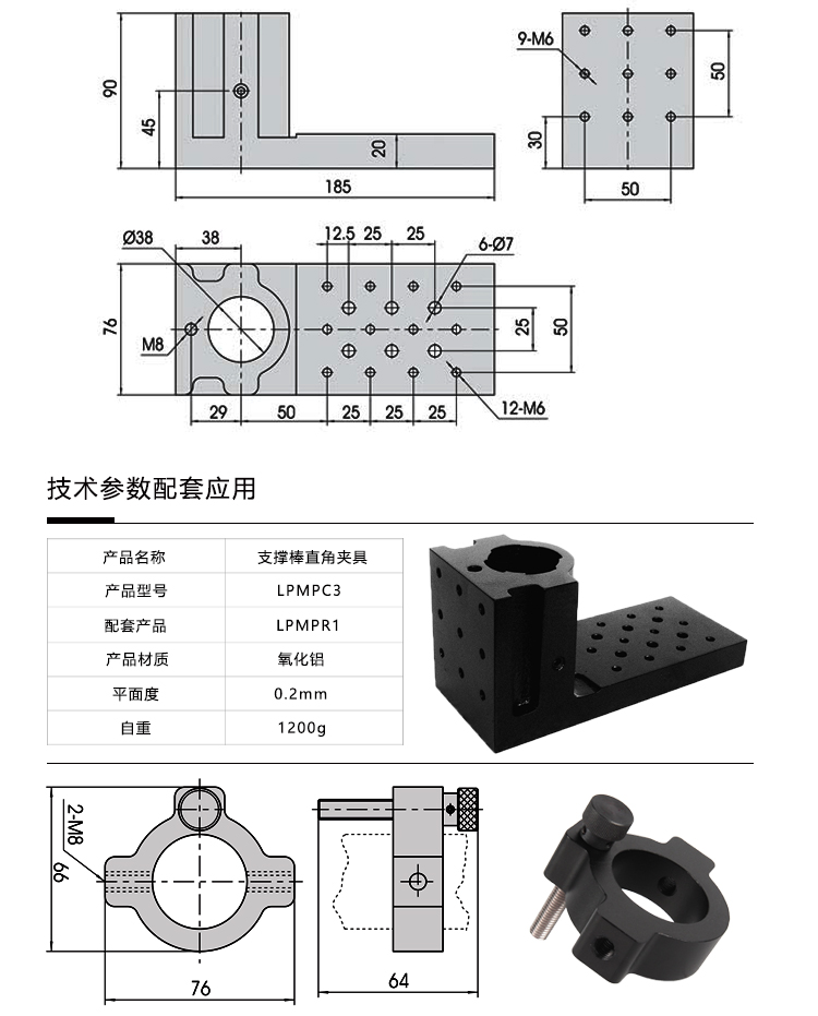 产品详情 LPMPC3支撑棒直角夹具 实验设备转接 在线咨询 产品详情 ● 配合LPMPR1系列支撑棒使用 ● 安装面上有标准孔距的M6螺纹孔和通孔,方便固定其它调整架或物品 ● 有垂直和水平两个安装面,方便使用 ● 采用顶丝锁紧方式,可将支撑棒直角夹具稳固锁定在不同高度 ● 采用拼接结构或铸件结构,结构稳固 本产品主要用途是通过直径为38的大直径支撑棒,实现光学器件连接。配合 LPMPR1系列支撑棒,可支撑及夹持多种物品。配套lp支撑棒夹具及LP系列 直角块、底板来连接各种光学实验器件,以满足不同实验需求。