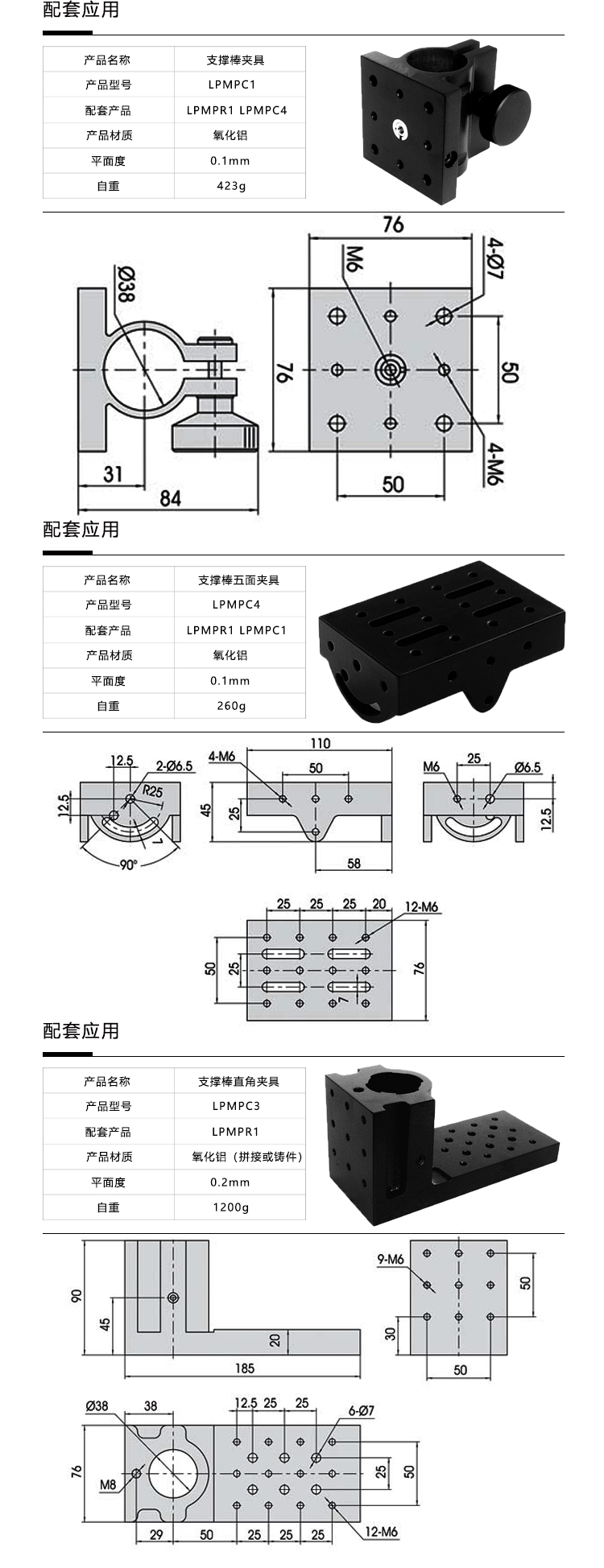 产品详情 LPMPC1支撑棒夹具 实验设备转接 在线咨询 产品详情 ● 直径粗,刚性好,承载大 ● 长度大,高度连续可调,调整范围大 ● 合理的硬重比设计,抗振能力好 ● 配合lpmpc系列支撑棒夹具使用,可支撑多种物品 ● 圆周无限位,支撑棒夹具可360°自由旋转方向,圆形底座可以拆下,直接利用其下方的M6螺杆与底板等连接 本产品主要用途是通过直径为38的大直径支撑棒,实现光学器件连接。配合 LPMPC系列支撑棒夹具,可支撑及夹持多种物品。配套LPMPC1 夹具、LPM PC3直角夹具、LPMPC4五面夹具及LP系列直角块、底板来连接各种光学实验 器件,以满足不同实验需求。