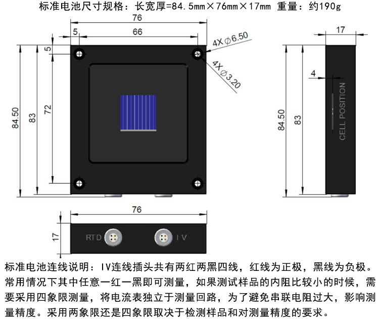 ● 标准太阳电池为2cm*2cm的单晶硅或多晶硅(可依据用户需要定制)光伏电池,经过老化、筛选,选择稳定性好、表面均匀的进行全密封式真空封装。