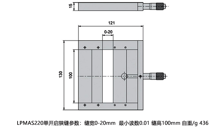 产品详情 LPMAS220手动单开启狭缝 光学实验 通光调节 遮光挡光实验 在线咨询 产品详情 ● 刀片单向开启,微分头调整可定量读数 ● 缝高大,缝高100mm ● 缝宽可调,0-20mm ● 最小读数,0.01 ● 配备可折启挡光板,避免杂散光 LPMAS系列可调式狭缝应用于在光学实验中经常需要用到不同宽度的线光源, 而通过狭缝实现是最常用最方便的方法。莱普科技推出的狭缝具有缝宽连续可 调,可单向,双向以及四向调整,可读数,刃口平滑齐整,开启灵活,精度高, 方便安装。