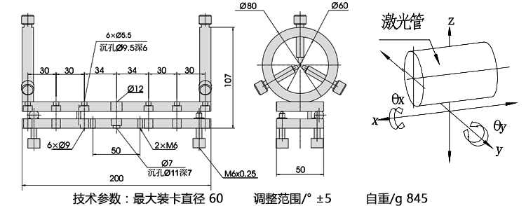 产品详情 LPMMA1激光管座 实验设备夹持 激光器 圆柱体等物品装卡 在线咨询 产品详情 ● 可将激光管旋转和俯仰调整 ● 前后两个固定三爪,固定牢固 ● 可夹持不同直径的激光管或圆柱体,且中心可调 ● 两个三爪相互距离可调,适应不同长短激光器 ● M6×0.25细牙螺杆驱动,碟形弹簧复位 激光管座主要用于光学器件的夹持,包括不同直径的激光管、圆柱体等多种需 要夹持的物品进行固定和装卡。配合光具座其他产品以满足实验用途的需要, 广泛应用于与光学相关的科研,教学,工业产品等光具类产品的夹持。
