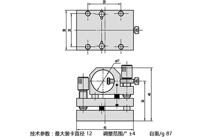 产品详情 LPMMA4激光管座 实验设备夹持 激光器 圆柱体等物品装卡 在线咨询 产品详情 ● 可将激光管俯仰和上下平移调整 ● 锁紧螺杆采用非金属材料,内孔加工有长槽,夹持安全稳定 ● 可夹持不同直径的激光管或圆柱体 ● M6×0.25细牙螺杆驱动,弹簧复位 激光管座主要用于光学器件的夹持,包括不同直径的激光管、圆柱体等多种需 要夹持的物品进行固定和装卡。配合光具座其他产品以满足实验用途的需要, 广泛应用于与光学相关的科研,教学,工业产品等光具类产品的夹持。