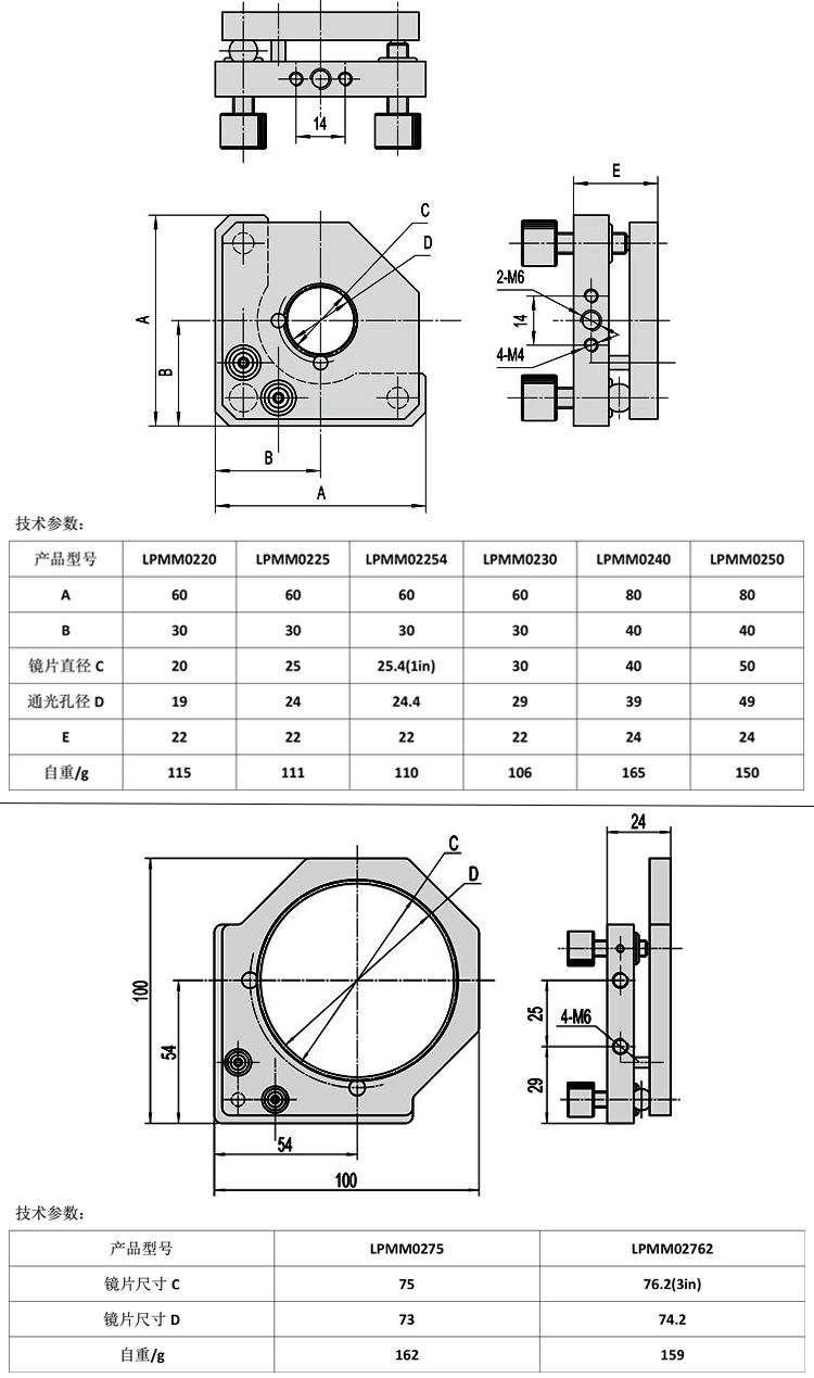 产品详情 LPMM02系列两维调整镜架 实验设备透镜镜片固定安装 在线咨询 产品详情 ● M6×0.25细牙螺杆调整(配铜螺母) ● 碟形弹簧复位,复位力可调,从零到刚性 ● 调整范围±3° ● 三点聚四氟乙烯支撑,保护镜片 ● 两个方向安装孔,适合不同光路方向 调整镜架可将镜片进行两维倾斜或多维固定调整。调整螺杆采用M6×0.25细牙 螺杆,提供精细调整。根据不同的镜片装卡方式,不同的装卡直径,不同的调 整螺杆,不同的弹性复位方式分出近百种规格,广泛应用于与光学相关的科研, 教学,工业产品特别是激光打标,激光焊接,激光雕刻,激光划片等激光加工 设备上。