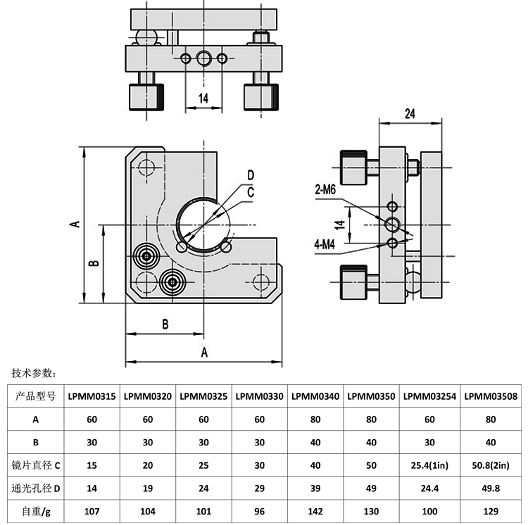 产品详情 LPMM03系列两维调整镜架 实验设备透镜镜片固定安装 在线咨询 产品详情 ● M6×0.25细牙螺杆调整(配铜螺母) ● 碟形弹簧复位,复位力可调,从零到刚性 ● 调整范围±3° ● 三点聚四氟乙烯支撑,保护镜片 ● 两个方向安装孔,适合不同光路方向 调整镜架可将镜片进行两维倾斜或多维固定调整。调整螺杆采用M6×0.25细牙 螺杆,提供精细调整。根据不同的镜片装卡方式,不同的装卡直径,不同的调 整螺杆,不同的弹性复位方式分出近百种规格,广泛应用于与光学相关的科研, 教学,工业产品特别是激光打标,激光焊接,激光雕刻,激光划片等激光加工 设备上。
