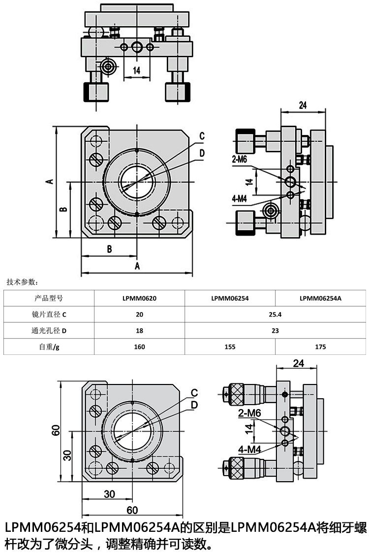 产品详情 LPMM06系列两维调整镜架 实验设备透镜镜片固定安装 在线咨询 产品详情 ● M6×0.25细牙螺杆调整,特殊铜螺母,可以轴向锁紧螺杆,防止震动松动 ● 碟形弹簧复位,复位力可调,从零到刚性,调整范围±3° ● 可在镜筒上装好镜片再固定到镜架上 ● 聚四氟乙烯垫片,保护镜片 ● 两个方向安装孔,适合不同光路方向 调整镜架可将镜片进行两维倾斜或多维固定调整。调整螺杆采用M6×0.25细牙 螺杆,提供精细调整。根据不同的镜片装卡方式,不同的装卡直径,不同的调 整螺杆,不同的弹性复位方式分出近百种规格,广泛应用于与光学相关的科研, 教学,工业产品特别是激光打标,激光焊接,激光雕刻,激光划片等激光加工 设备上。