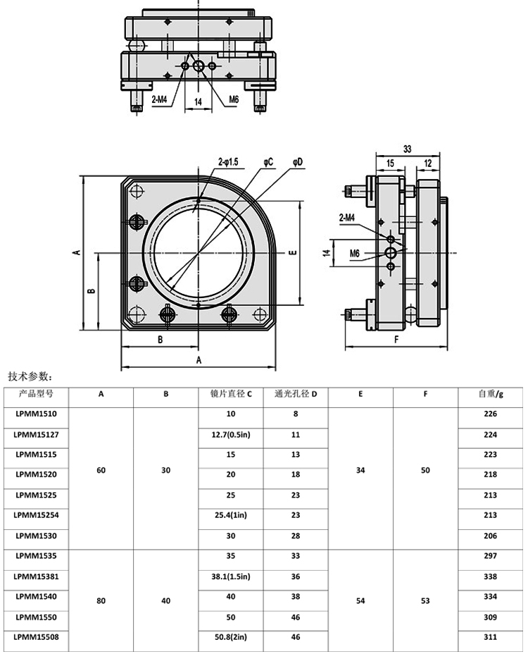 产品详情 LPMM15系列两维调整镜架 光学实验镜片安装镜片位移调整 在线咨询 产品详情 ● M6×0.25细牙螺杆调整,特殊铜螺母,可以轴向锁紧螺杆,防止震动松动 ● 拉簧复位,复位力均匀,减少应力, ● 调整范围±3° ● 聚四氟乙烯垫片,保护镜片 ● 两个方向安装孔,适合不同光路方向 调整镜架可将镜片进行两维倾斜或多维固定调整。调整螺杆采用M6×0.25细牙 螺杆,提供精细调整。根据不同的镜片装卡方式,不同的装卡直径,不同的调 整螺杆,不同的弹性复位方式分出近百种规格,广泛应用于与光学相关的科研, 教学,工业产品特别是激光打标,激光焊接,激光雕刻,激光划片等激光加工 设备上。