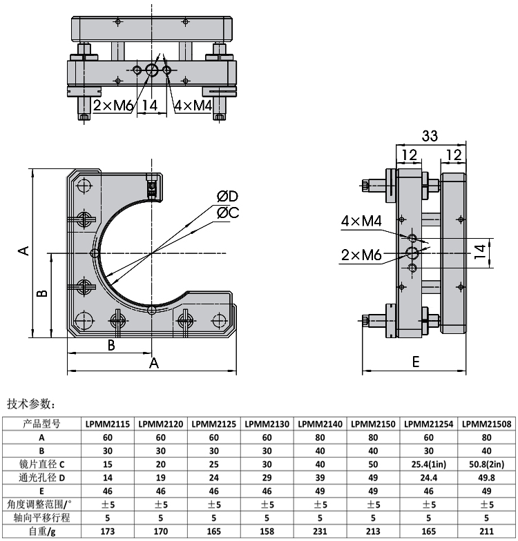 产品详情 LPMM21系列三维调整镜架 光学实验镜片安装镜片位移调整 在线咨询 产品详情 ● 三个M6×0.25细牙螺杆调整,特殊铜螺母,可以径向锁紧螺杆,防止震动松动,锁紧过程中螺杆不移位 ● 调整范围±3°,可实现一维轴向平移和两维倾斜调整功能 ● 三点聚四氟乙烯支撑,保护镜片 ● 两个方向安装孔,适合不同光路方向 调整镜架可将镜片进行两维倾斜或多维固定调整。调整螺杆采用M6×0.25细牙 螺杆,提供精细调整。根据不同的镜片装卡方式,不同的装卡直径,不同的调 整螺杆,不同的弹性复位方式分出近百种规格,广泛应用于与光学相关的科研, 教学,工业产品特别是激光打标,激光焊接,激光雕刻,激光划片等激光加工 设备上。