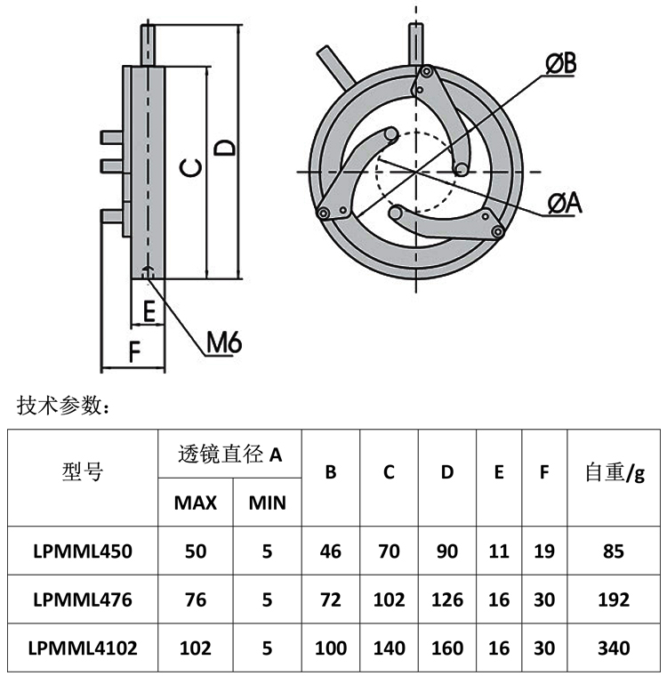 产品详情 LPMML4系列自定心透镜架 光学实验镜片安装座自定心透镜支架 在线咨询 产品详情 ● 三个支撑臂同时连续开启 ● 适用不同直径的透镜 ● 更换透镜时,透镜中心不变 ● 弹簧自动复位,适用较轻重量的透镜 ● 最小夹持5,最大夹持102 自定心透镜架可以夹持多种镜片或圆柱体,适应性强,装卸方便,夹持牢固。镜 架根据不同的镜片装卡方式,不同的装卡直径,不同的调整螺杆,不同的弹性复 位方式分出近百种规格,广泛应用于与光学相关的科研,教学,工业产品特别是 激光打标,激光焊接,激光雕刻,激光划片等激光加工设备上。
