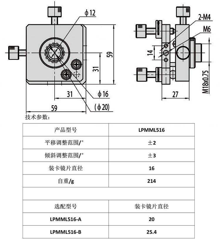 ● M6×0.25细牙螺杆调整,特殊铜螺母,可以轴向锁紧螺杆,防止震动松动