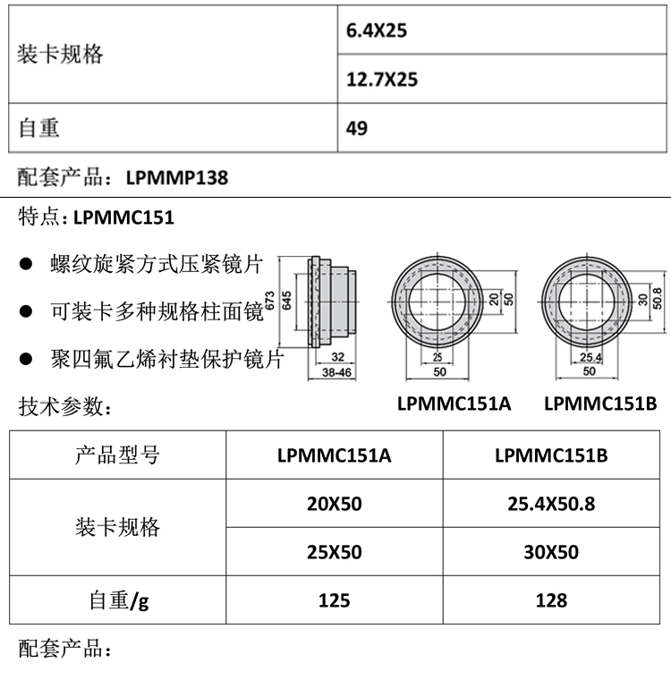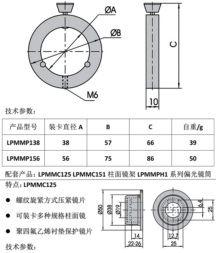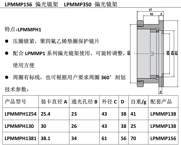 产品详情 LPMMP1系列光学偏光调整镜架 光学实验镜片安装座偏光透镜支架 在线咨询 产品详情 ● 周圈360°刻划 ● 可定量调节偏光镜或柱面镜 ● 弹性卡紧手轮,装卡方便稳定 ● 聚四氟乙烯三点支撑 偏光镜架可将镜片进行两维倾斜或多维固定调整。调整螺杆采用细牙螺杆,锁 紧手轮等固定方式,提供精细调整。根据不同的镜片装卡方式,不同的装卡直 径,不同的调整螺杆,不同的弹性复位方式分出近百种规格,广泛应用于与光 学相关的科研,教学,工业产品特别是激光打标,激光焊接,激光雕刻,激光 划片等激光加工设备上。