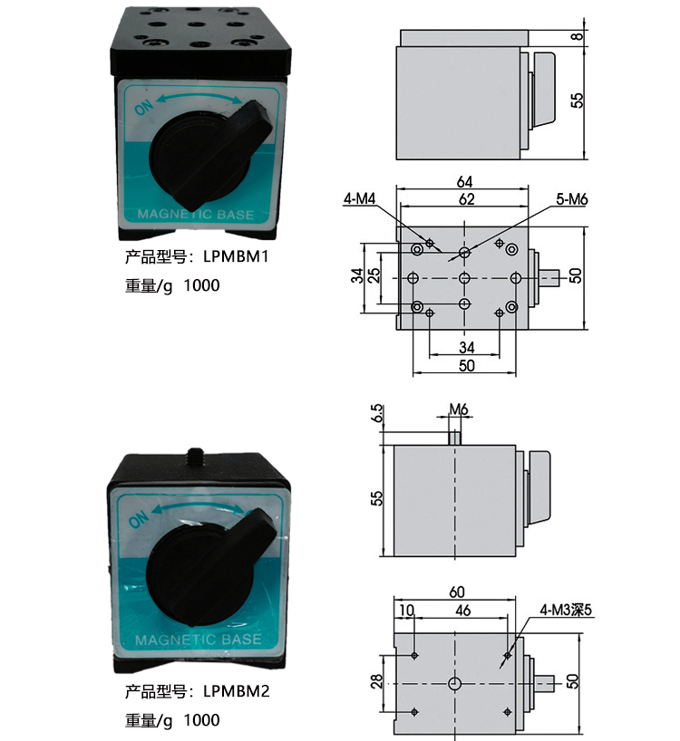 产品详情 LPMBM1LPMBM2磁力底座 用于科研实验物品磁力吸附底座转接固定 在线咨询 产品详情 ● 磁力通过开关通断 ● 结构简单,操作方便 ● 配套支撑杆及支撑杆架组合使用 ● 最大吸附力 ≤60kg(导磁平面粗糙度厚度不同影响吸附力效果) ● 自重 1kg LPMBM系列磁力底座内有永磁体,通过开关结构设计可以达到通断磁力或使 磁力从零到最大渐变。所以如果您的实验室有光学平台或其它铁磁体平台,选 用磁力底座来固定,调整物件是方便快捷的,可以不受固定孔位置限制。