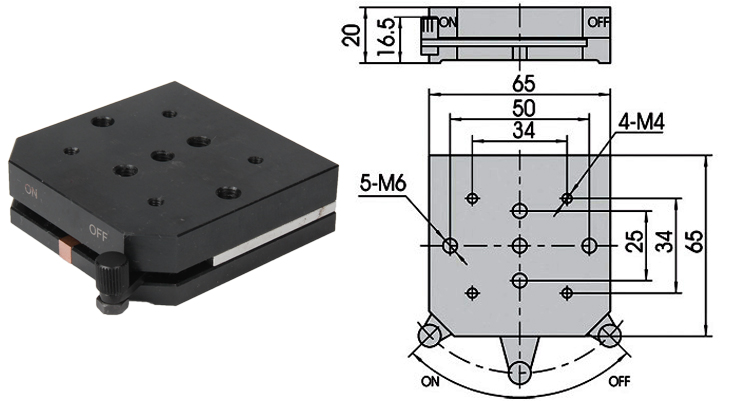 产品详情 LPMBM4磁力底座 用于科研实验物品磁力吸附底座转接固定 在线咨询 产品详情 ● 磁力通过开关通断 ● 磁力从0到23kg连续可调 ● 上表面标准孔距的螺纹孔方便配套使用 ● 最大吸附力 0-<23kg(导磁平面粗糙度厚度不同影响吸附力效果)高度20mm ● 自重 550g LPMBM系列磁力底座内有永磁体,通过开关结构设计可以达到通断磁力或使 磁力从零到最大渐变。所以如果您的实验室有光学平台或其它铁磁体平台,选 用磁力底座来固定,调整物件是方便快捷的,可以不受固定孔位置限制。