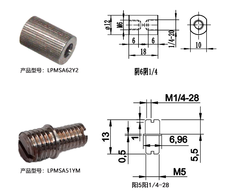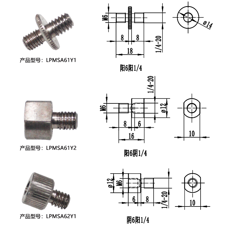 产品详情 LPMSA系列英制转换变径螺钉 用于科研实验等物品转接不同螺纹直径转换 在线咨询 产品详情 ● 可用于改变不同直径的螺纹 ● LPMSA系列变径螺钉有多种规格,选择灵活,安装方便 ● LPMSA61Y2注解:6代表M6。1代表(阳)外螺纹,2代表(阴)内螺纹,Y代表英制1/4英寸-20 变径螺钉主要用途可用于将不同直径的螺纹进行转换、转接,满足因不同实验 需要对螺纹安装孔位有变化的情况下选择转接螺钉进行安装,广泛应用于与光 学相关的科研,教学,工业产品等光具类产品的安装与固定。