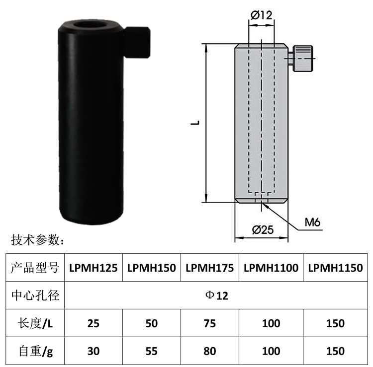 产品详情 LPMH1系列支撑杆架(可配套直径12mm支撑杆) 应用于实验设备固定转接与光学平台连接 在线咨询 产品详情 ● 中心12mm圆孔,可将LPMP系列支撑杆固定在不同高度 ● 中心孔有加工V形长槽,在调整接杆高度时不产生其它位置变化,并且锁紧稳定 ● 底部M6螺纹孔方便与其它光具座连接 莱普科技杆架可用于光学光具类产品的固定与连接,满足试验当中对不同需求, 配合LPMP系列支撑杆组合使用,以达到光学实验中需要的不同高度。杆架有5 种规格,均配有锁紧固定手钮,底部带有与平台光具座连接的M6螺纹孔,杆架 包括锁紧固定、升降微调、手动旋转等多种功能。杆架是光学实验、科研研发、 加工生产中广泛应用的支撑转接器材。