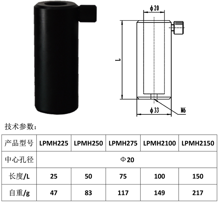 产品详情 LPMH2系列支撑杆架(可配套直径20mm支撑杆) 应用于实验设备固定转接与光学平台连接 在线咨询 产品详情 ● 中心20mm圆孔,可将LPMP系列支撑杆固定在不同高度 ● 中心孔有加工V形长槽,在调整接杆高度时不产生其它位置变化,并且锁紧稳定 ● 底部M6螺纹孔方便与其它光具座连接 莱普科技杆架可用于光学光具类产品的固定与连接,满足试验当中对不同需求, 配合LPMP系列支撑杆组合使用,以达到光学实验中需要的不同高度。杆架有5 种规格,均配有锁紧固定手钮,底部带有与平台光具座连接的M6螺纹孔,杆架 包括锁紧固定、升降微调、手动旋转等多种功能。杆架是光学实验、科研研发、 加工生产中广泛应用的支撑转接器材。