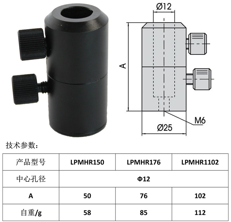 产品详情 LPMHR1系列旋转支撑杆架(可配套直径12支撑杆) 应用于实验设备固定转接与光学平台连接 在线咨询 产品详情 ● 中心12mm圆孔,可将LPMP系列支撑杆固定在不同高度 ● 可使接支撑杆绕杆轴360°旋转而不改变其它位置参数 ● 旋转部与固定部通过精密轴承连接,转动舒适,支撑杆和旋转部均可可靠锁紧 ● 底部M6螺纹孔方便与其它光具座连接 莱普科技杆架可用于光学光具类产品的固定与连接,满足试验当中对不同需求, 配合LPMP系列支撑杆组合使用,以达到光学实验中需要的不同高度。杆架有3 种规格,均配有锁紧固定手钮,底部带有与平台光具座连接的M6螺纹孔,杆架 包括锁紧固定、升降微调、手动旋转等多种功能。杆架是光学实验、科研研发、 加工生产中广泛应用的支撑转接器材。
