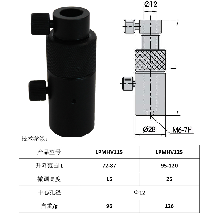 产品详情 LPMHV1系列升降支撑杆架(可配套直径12支撑杆) 应用于实验设备升降固定转接与光学平台连接 在线咨询 产品详情 ● 中心12mm圆孔,可将LPMP系列支撑杆固定在不同高度 ● 调整支撑杆高度而支撑杆的角相位不变 ● 升降螺纹微调高度,支撑杆和升降部均可可靠锁紧 ● 底部M6螺纹孔方便与其它光具座连接 莱普科技杆架可用于光学光具类产品的固定与连接,满足试验当中对不同需求, 配合LPMP系列支撑杆组合使用,以达到光学实验中需要的不同高度。杆架有2 种规格,均配有锁紧固定手钮,底部带有与平台光具座连接的M6螺纹孔,杆架 包括锁紧固定、升降微调、手动旋转等多种功能。杆架是光学实验、科研研发、 加工生产中广泛应用的支撑转接器材。