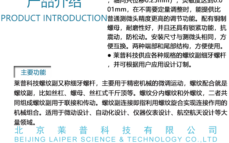 莱普科技螺纹副又称细牙螺杆,主要用于精密机械的微调运动,螺纹配合就是螺纹副,比如丝杠、螺母、
