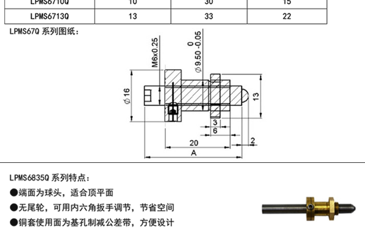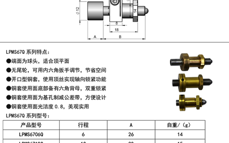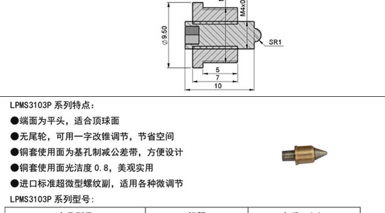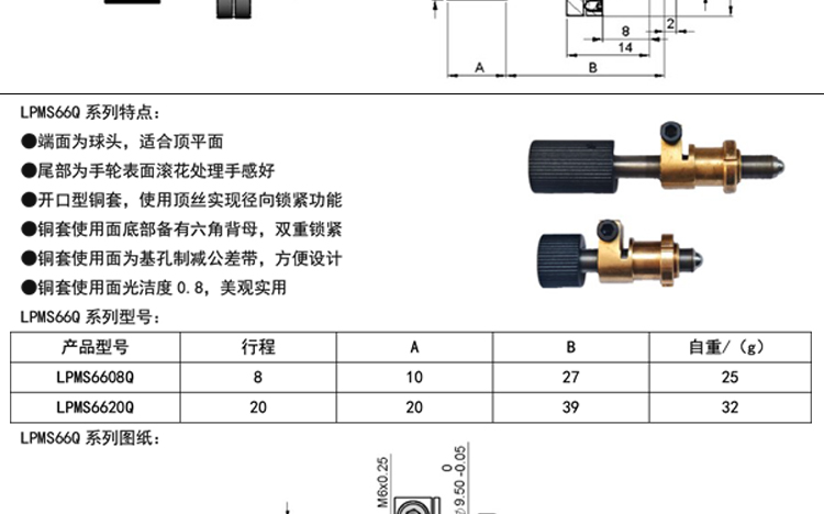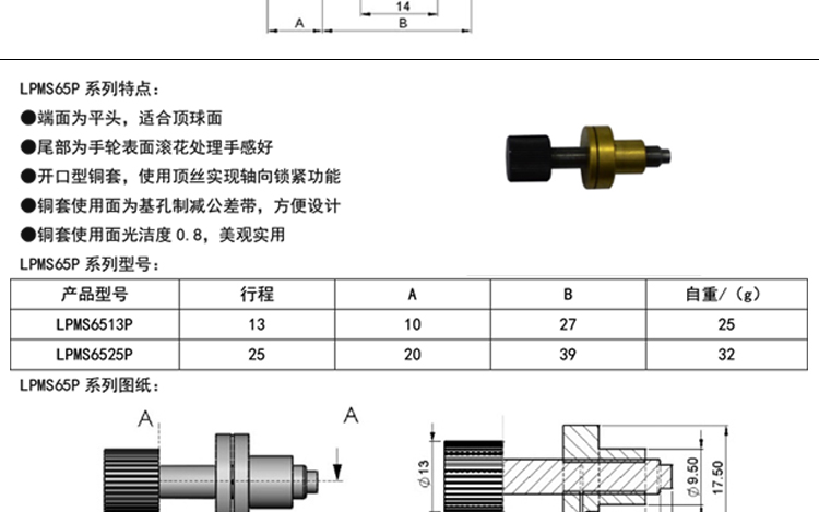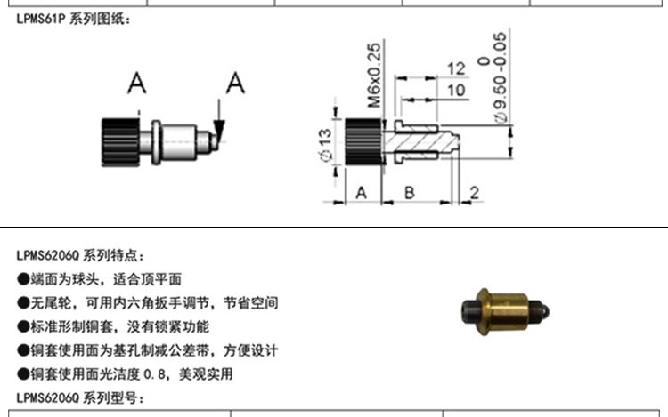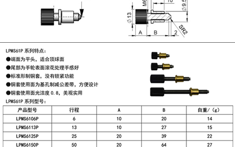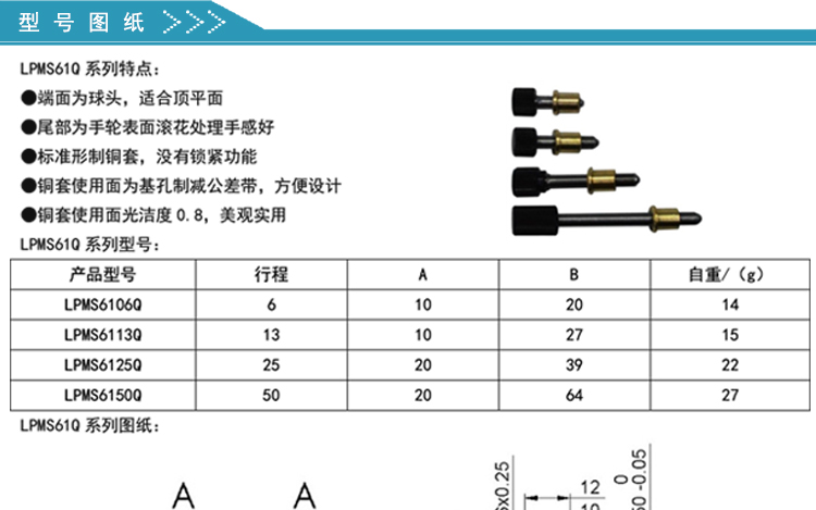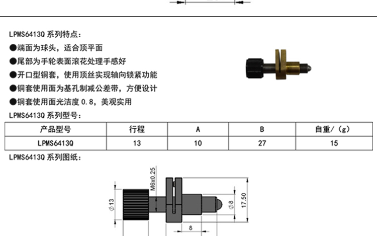 耐磨性好,并且还具有锁紧功能,抗震动,防松动。安装尺寸与测微头相同,方便互换。两种端部和尾部结构,