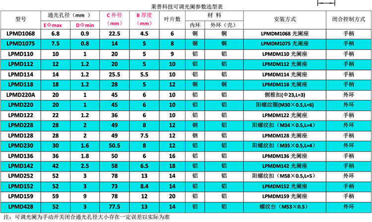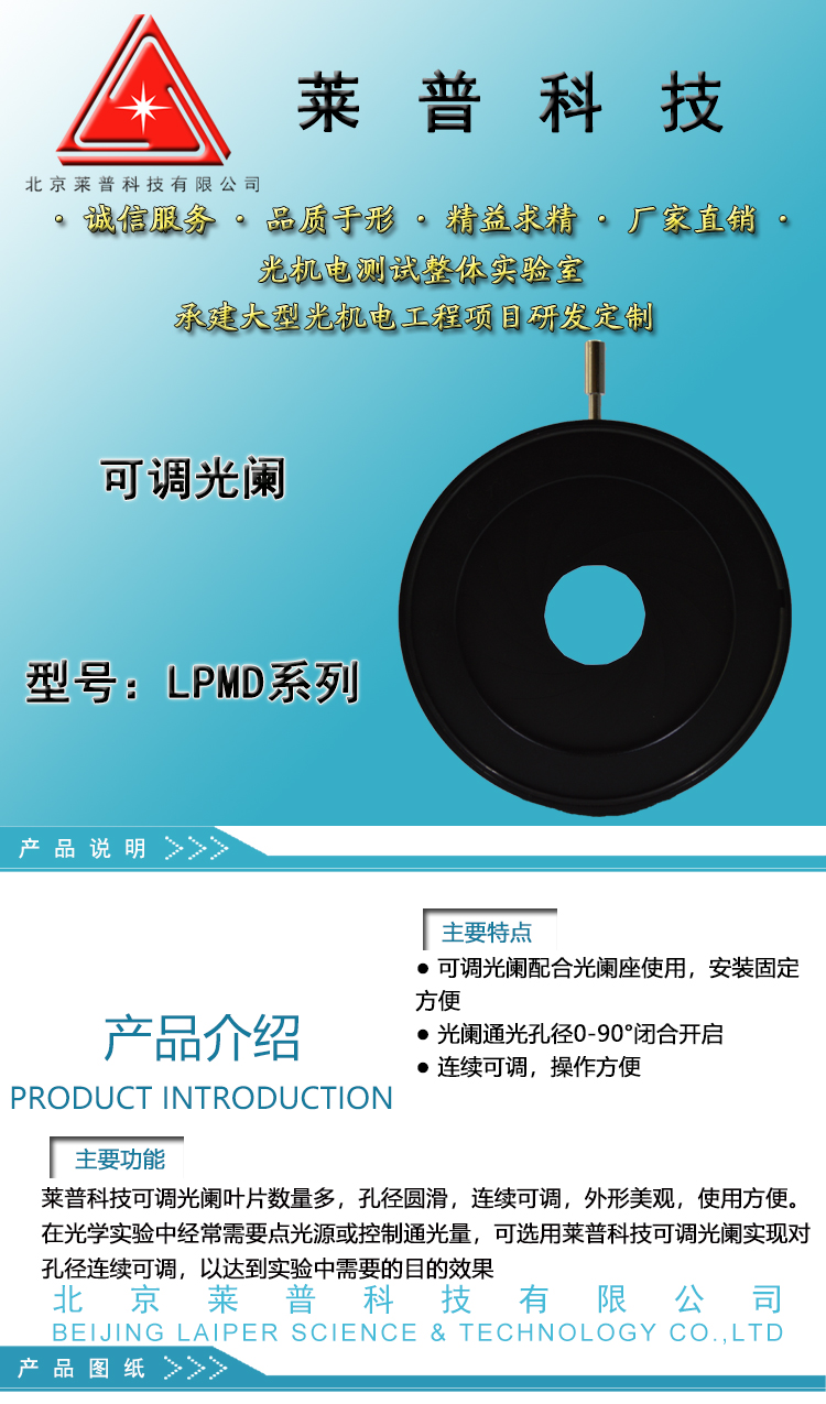 产品详情 LPMD系列可调变径光阑 应用于对孔径连续可调,以达到实验中需要的目的效果 在线咨询 产品详情 ● 可调光阑配合光阑座使用,安装固定方便 ● 光阑通光孔径0-90°闭合开启 ● 连续可调,操作方便 莱普科技可调光阑叶片数量多,孔径圆滑,连续可调,外形美观,使用方便。 在光学实验中经常需要点光源或控制通光量,可选用莱普科技可调光阑实现对 孔径连续可调,以达到实验中需要的目的效果