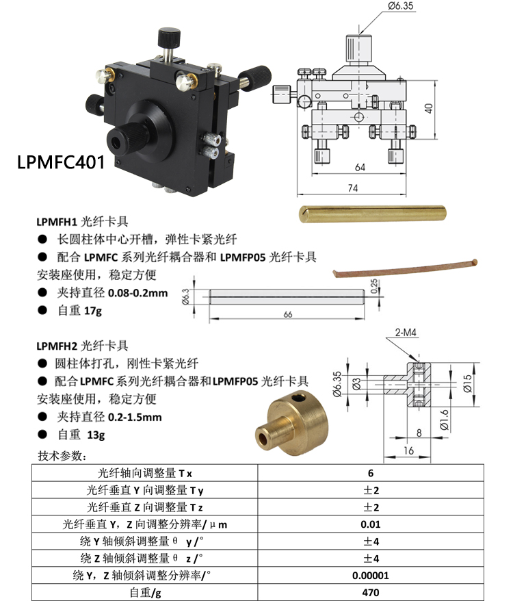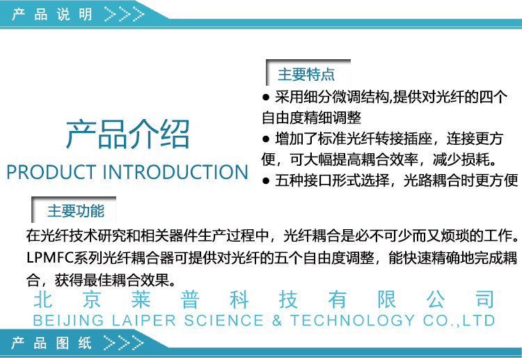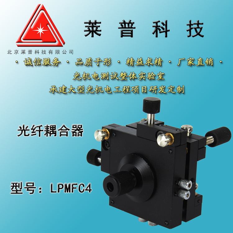 产品详情 LPMFC4系列光纤耦合器 主要应用于对光纤位移精密调整实现光纤耦合 在线咨询 产品详情 ● 采用细分微调结构,提供对光纤的四个自由度精细调整 ● 增加了标准光纤转接插座,连接更方便,可大幅提高耦合效率,减少损耗。 ● 五种接口形式选择,光路耦合时更方便 在光纤技术研究和相关器件生产过程中,光纤耦合是必不可少而又烦琐的工作。 LPMFC系列光纤耦合器可提供对光纤的五个自由度调整,能快速精确地完成耦 合,获得最佳耦合效果。
